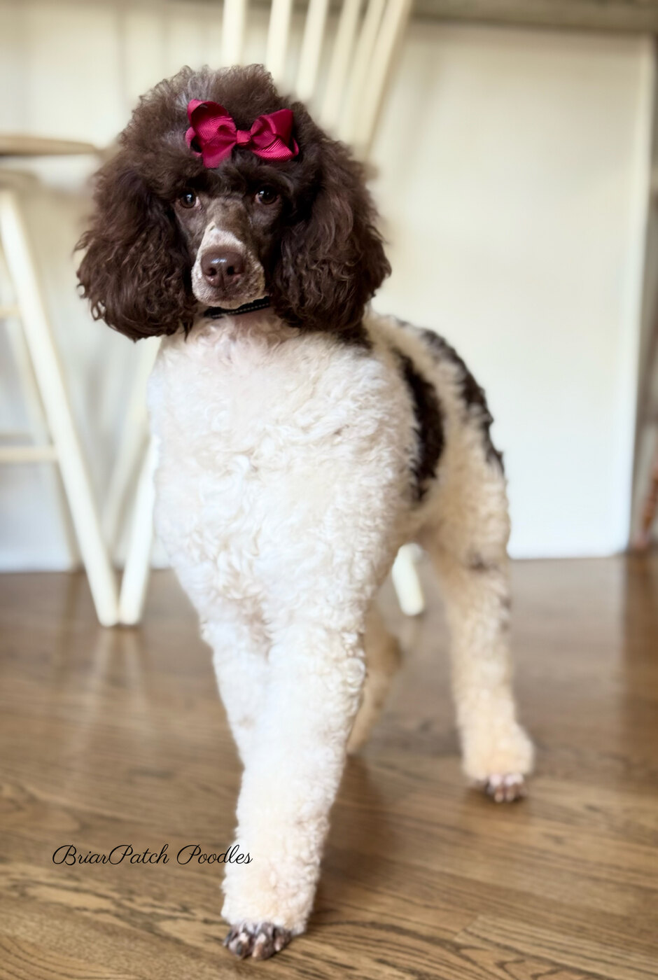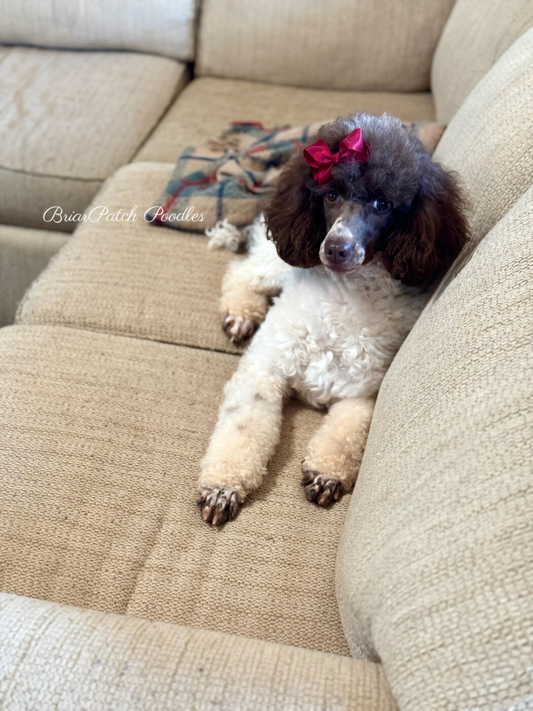 She has such a joyful, happy and kind spirit and always looking for an opportunity to brighten someone's day. She is athletic and agile, with a dainty lightness to her Poodle prance, but her absolute favorite place to be is someone's lap. She absolutely cherishes people and is always begging for attention.