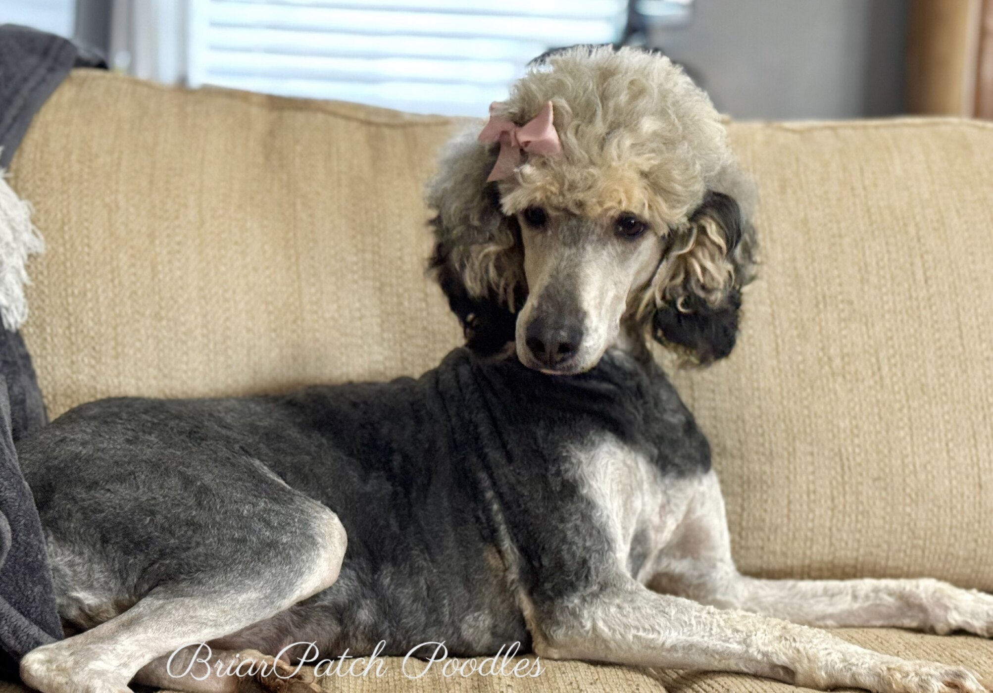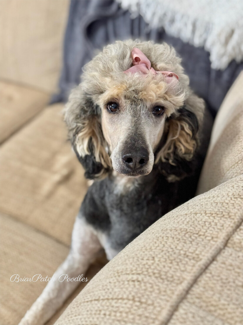 Her stunning, and correct structure, is elegant and feminine, truly everything I love about Poodles. She is intelligent, cuddly and kind. She is driven enough to be a fun, intelligent companion, but modest enough to have an easy going demeanor that is perfect for our family with children, who she absolutely adores. If someone isn't asking her to play, you can find her sleeping on the couch.